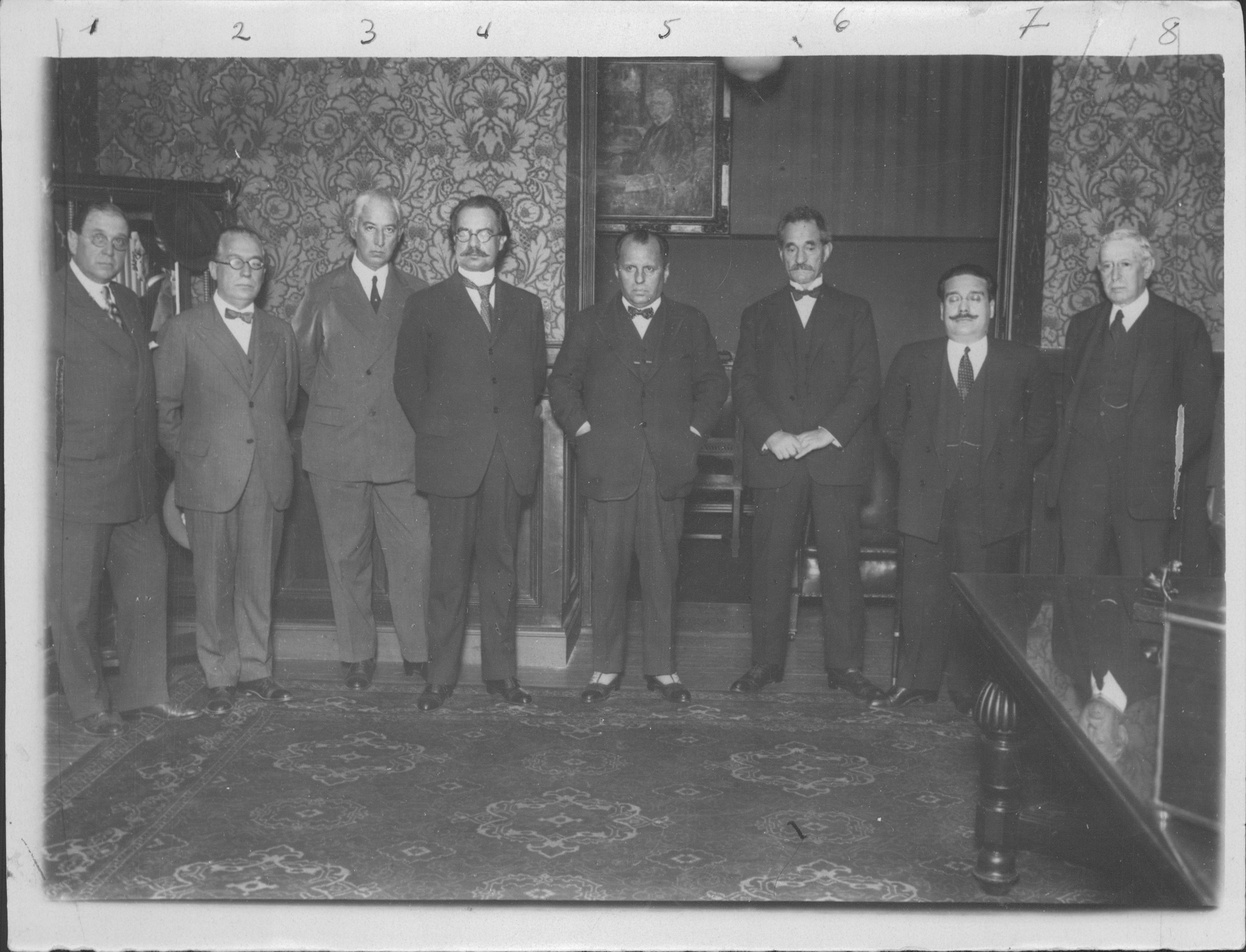 1 - sin datos; 2 - Sin datos; 3 – Ing. Nicolas Besio Moreno; 4 – Rector Ricardo Rojas; 5 - Dr. Antonio Sagarna, Mtro de Justicia e Instrucción Publica; 6 - Prof. Italiano Arturo farinilli; 7 - Dr. Coriliano Alberini, decano; 8 – Dr. José Matienzo.