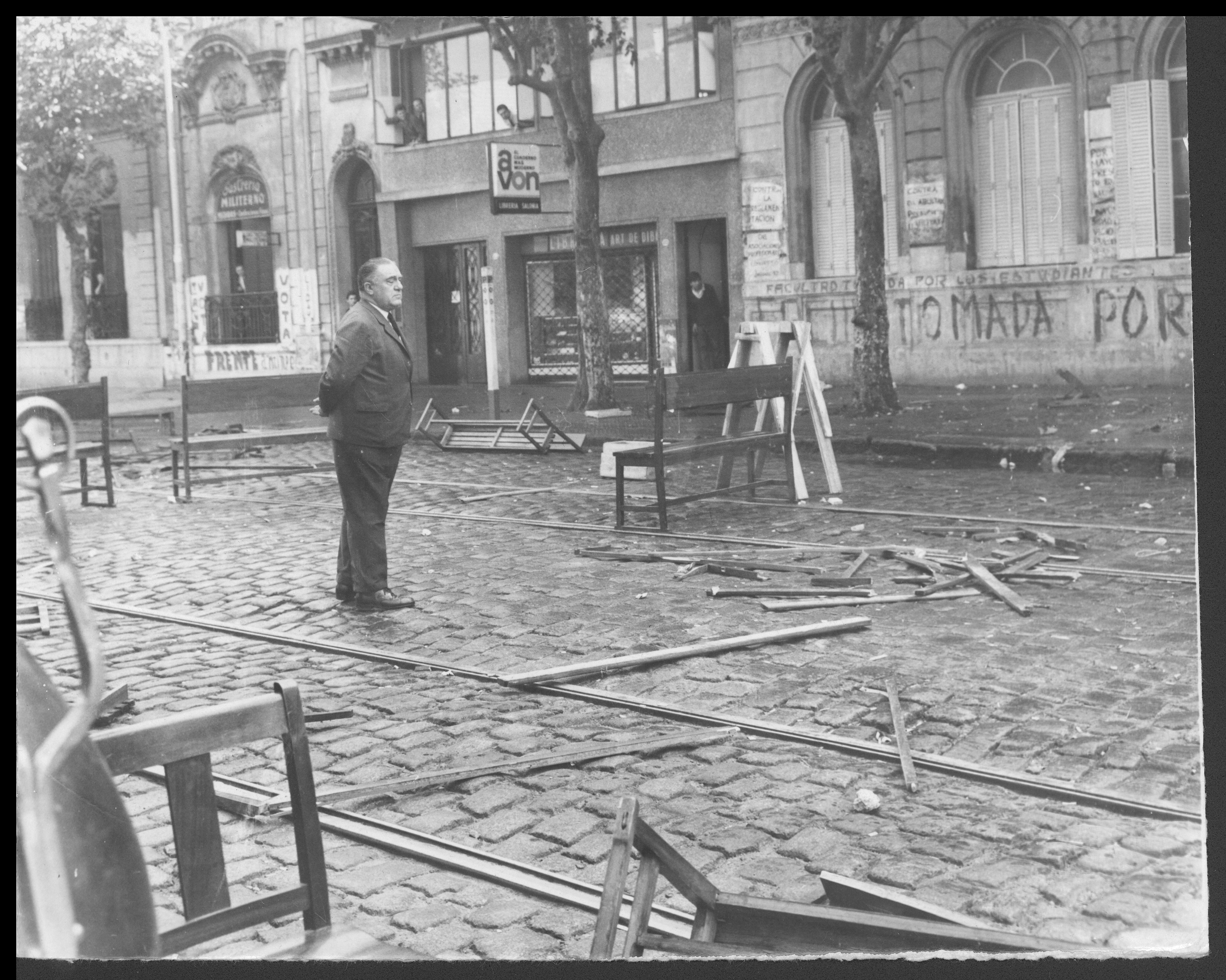 El decano Prof. Luis Aznar en medio de la calzada frente al edificio, luego de los disturbios.
