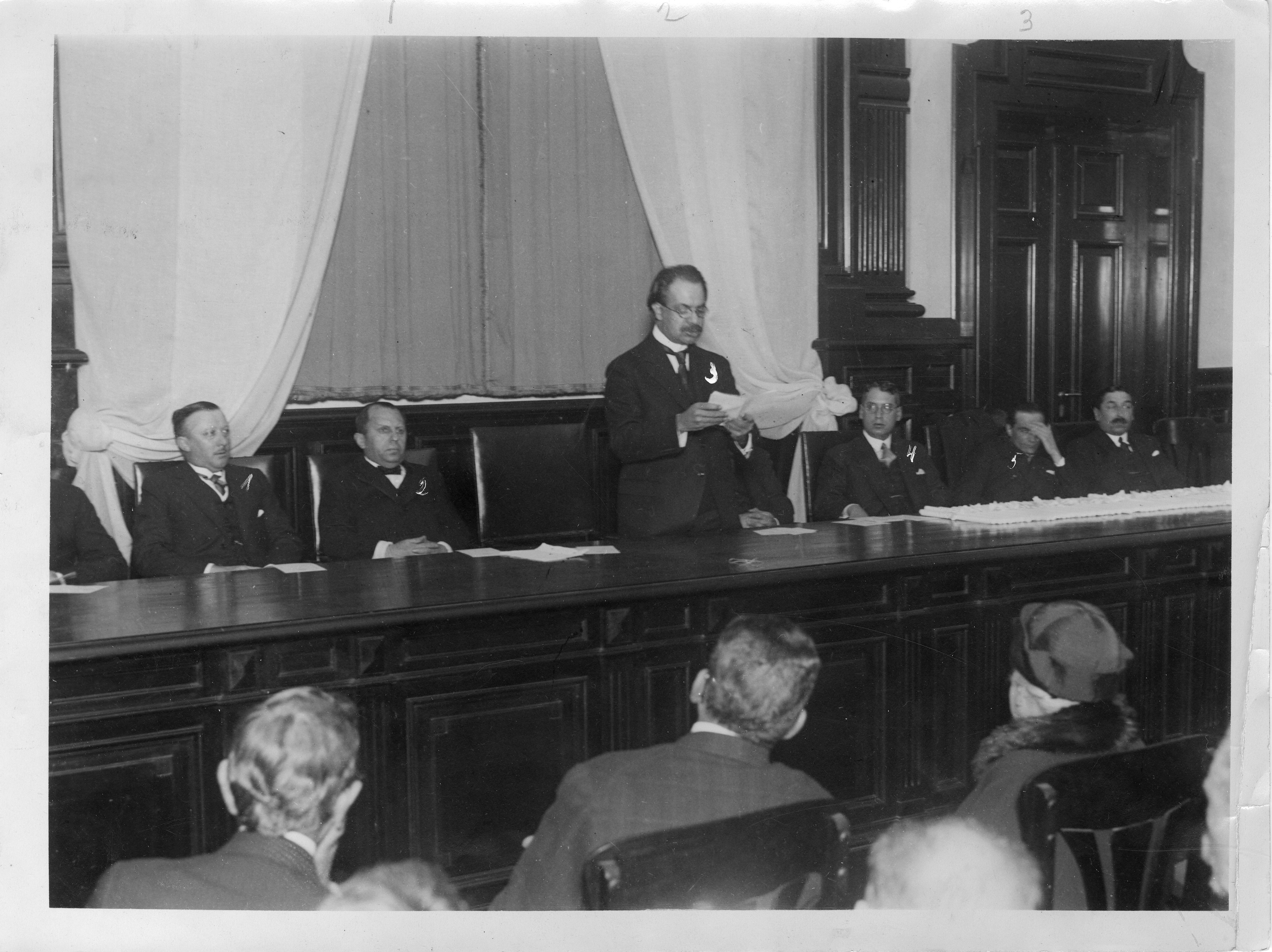 Escuchan a Ricardo Rojas, Mtro. De Justicia e Instrucción Publica Dr. Antonio Sagarna, Enrique Butty.